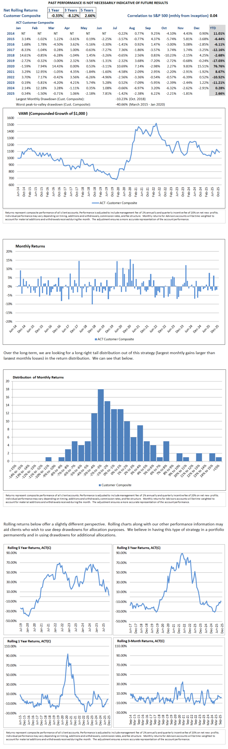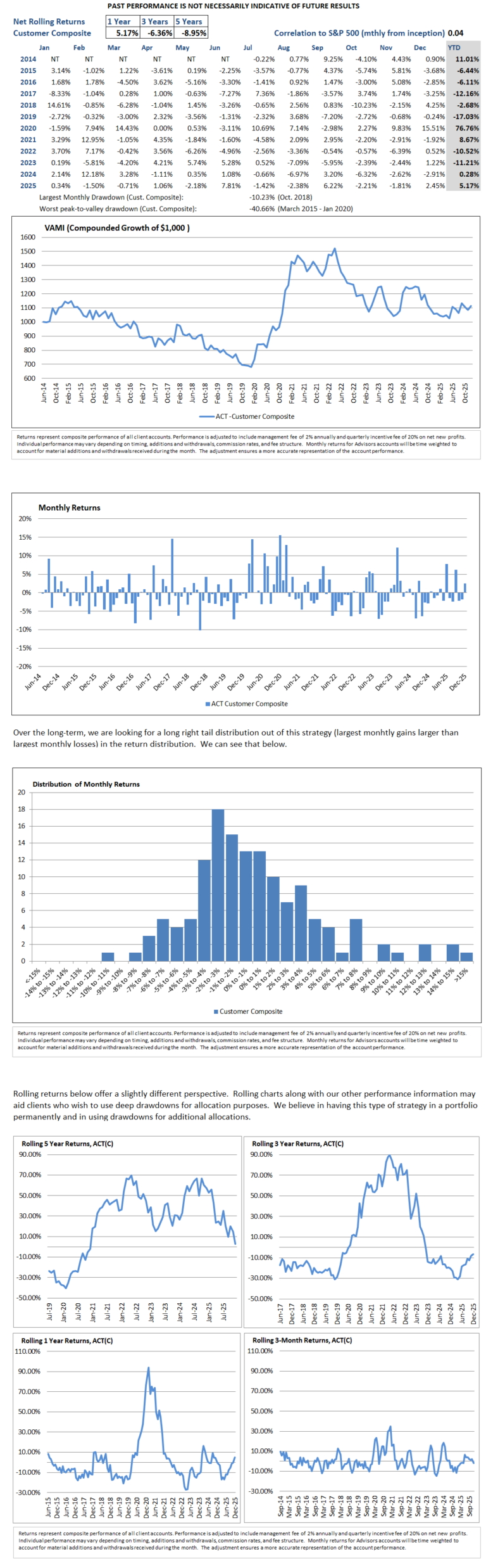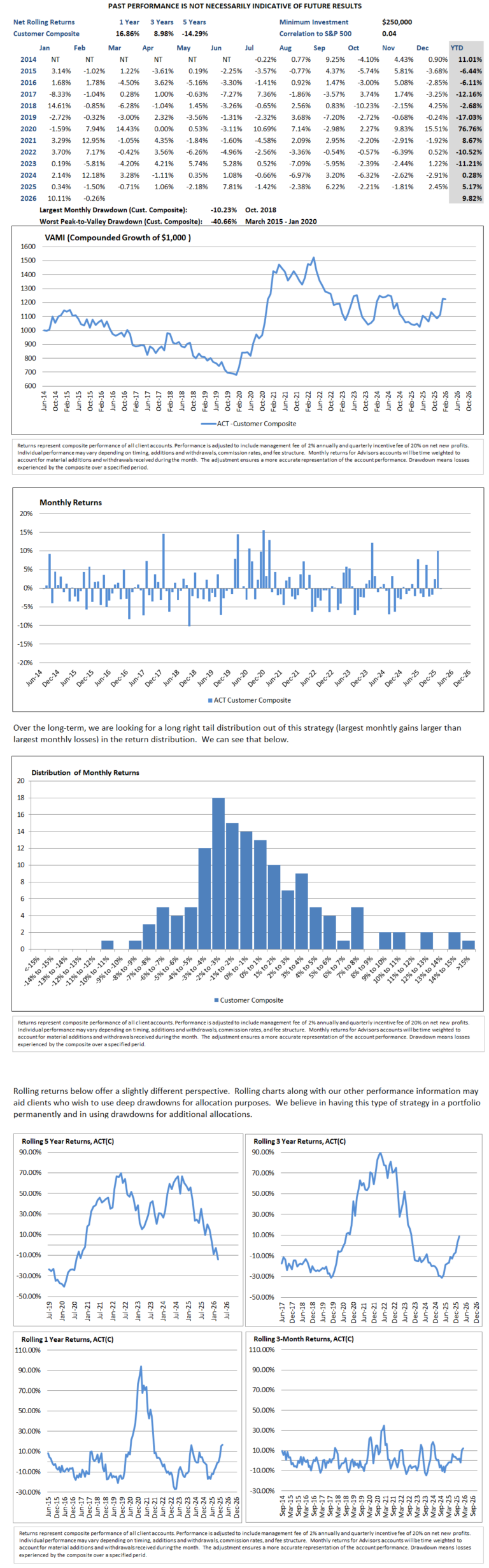 Performance accounting is performed by outside provider specializing in this industry. Variance between composites or composites and individual accounts is expected to be minimal, but is sometimes possible for the following reasons: new assets are being scaled in, capitalization differences, fee differences at your FCM, or fee agreement differences with ACT.